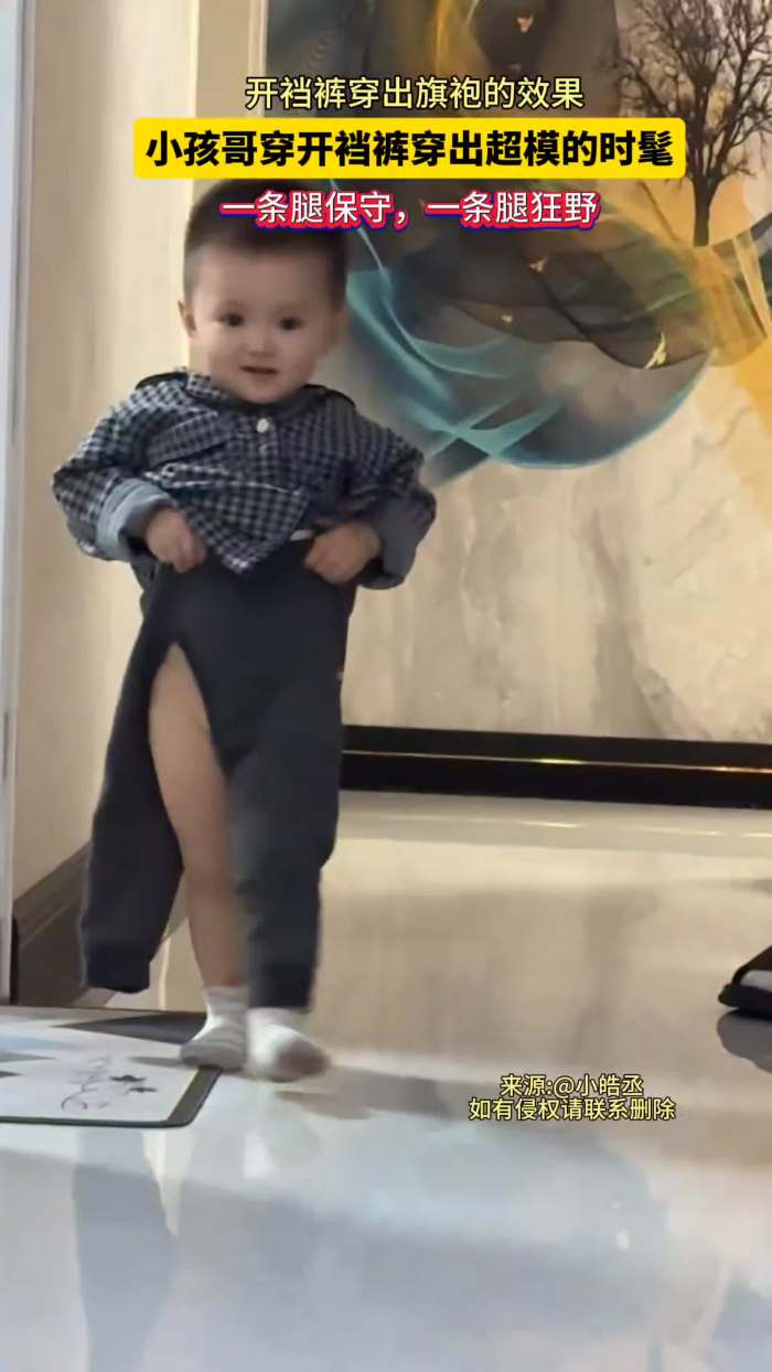 - 开裆裤穿出旗袍的效果 小孩哥穿开裆裤穿出超模的时髦 一条腿保守,一条腿狂野
