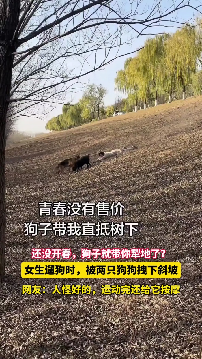 还没开春,狗子就带你犁地了?女生遛狗时,被两只狗狗拽下斜坡