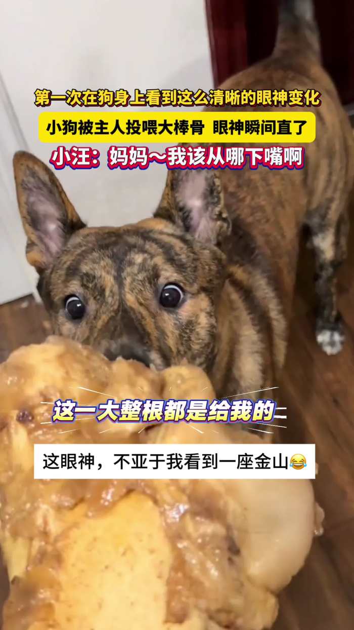 第一次在狗身上看到了这么清晰的眼神变化!小狗被主人投喂大棒骨,眼神瞬间直了!小汪:妈妈,我该从哪下嘴啊