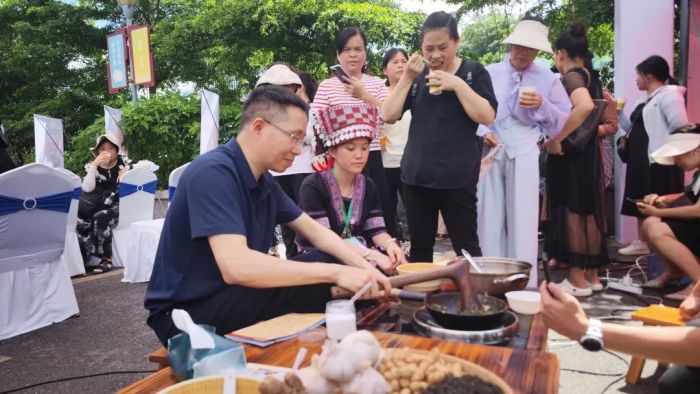 本次活动以“油茶飘香道千年,鹏城相聚赴未来”为主题,旨在深入推广恭城油茶非物质文化遗产,推动粤桂两地特色饮食资源交流,拓展油茶市场渠道,助力地方特色产业发展和乡村振兴。活动当天现场人气高涨,气氛热烈,油茶飘香、歌舞飞扬。该活动为深圳市民带来了一场独具瑶乡风味的非遗盛宴。