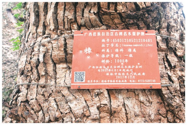 红色的自治区古树名木保护牌,将隆家村的千年古樟列为一级保护。赵积亮 摄