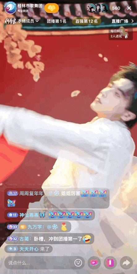 最近,在央视和抖音直播联合推出的“开播吧!国潮”直播竞演活动中,桂林市歌舞团进入了团播赛道的决赛,演绎了团舞《天下》。演员沐凡执剑而起,甩腕、腾跃、劈斩,展示了他的独家技巧“云门大卷”。观众们留下评论:“绝对实力”“很震撼”。