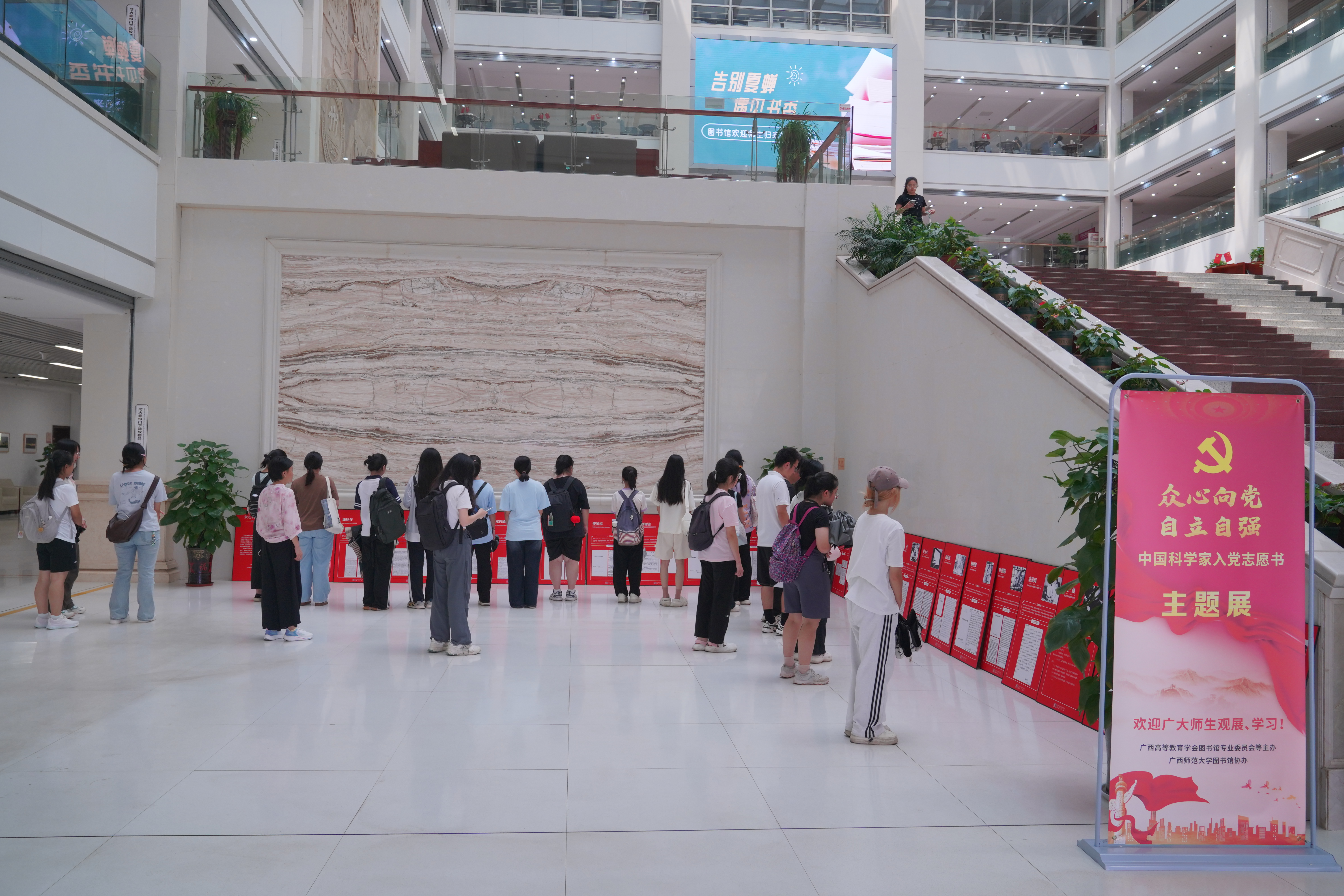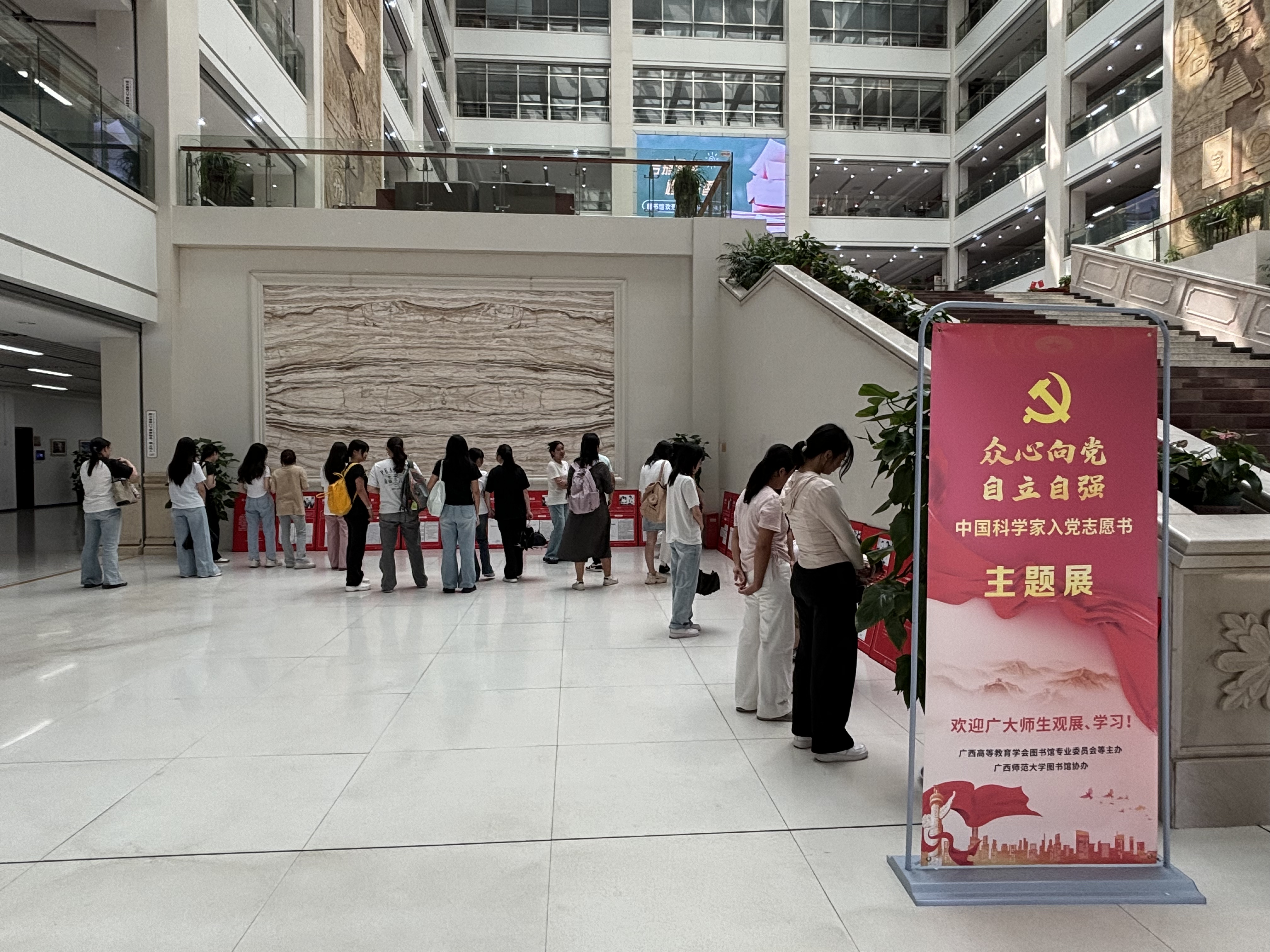为大力弘扬科学家精神,传承红色科技基因,激励广大科技工作者和青年学子勇担时代使命,9月11日,由广西高等教育学会图书馆专业委员会主办、我校图书馆协办的“众心向党 自立自强——中国科学家入党志愿书主题展”在我校雁山校区图书馆二楼大厅正式开展。