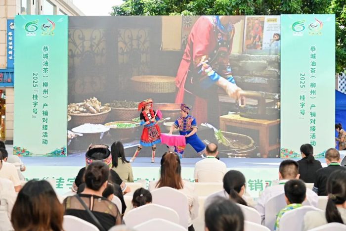 活动现场,恭城油茶文化宣传大使现场演示传统“打油茶”技艺,用7字形木槌不停地捶打锅中的茶叶,吸引宾客们驻足品尝体验,同时融入瑶族特色歌舞等文化展示环节,为观众与客商呈现一场兼具味觉享受、文化体验与产业价值的双重盛宴。