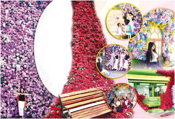 在翊武路,一家餐厅门口的仿真花墙让人眼前一亮。记者看到,花墙的布置很用心思,特意做了一个橱窗造型,看起来更加自然。花墙上还有两个插孔能给手机充电,台阶上放了一张小桌和三个草垫,方便游人坐着拍照。工作人员介绍,今年8月中旬,他们花了两天时间布置花墙,用了绣球花、玫瑰、菊花、格桑花等,面积约6平方米,目的就是营造氛围吸引客流,实际效果也不错,很多市民游客都会停下拍照。两名河南女游客穿着民族服饰在迎宾桥拍完照片,看到这个花墙立即停下拍照,称赞它既好看又有创意,出了好几张满意的大片。