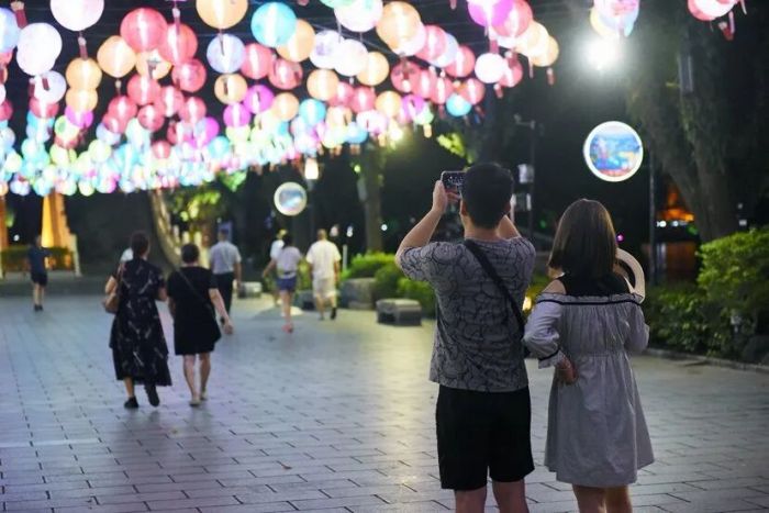 童趣花灯“海洋”下散步 体验宋代拜月大典