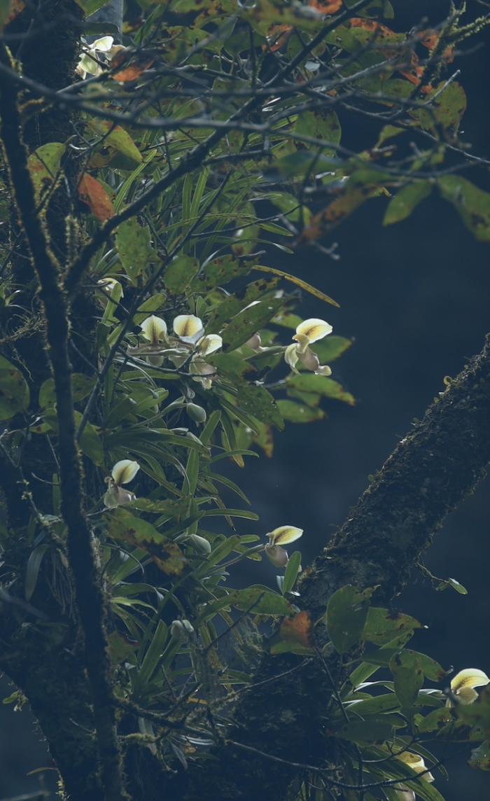 本次专项调查,监测队员综合运用无人机航拍、长焦相机及望远镜观测等技术手段,结合地面地毯式搜寻,对紫毛兜兰种群进行了全面普查。本次观测到附生于峭壁或树上的紫毛兜兰64丛(株)开花植株中,有40丛开花2朵以上,24株为单朵开放,叶片狭长圆润,在光照下显得晶莹透亮,金黄色花瓣边缘点缀着欲滴的露珠,更显优雅动人。