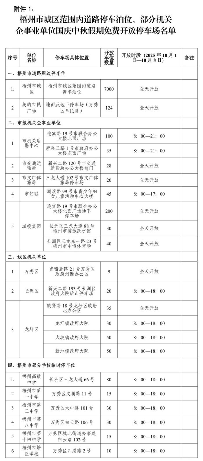 为方便市民群众和游客出行,经市政府同意,2025年国庆、中秋节假期期间免费开放梧州市城区停车位、部分机关企事业单位停车场,公告如下: