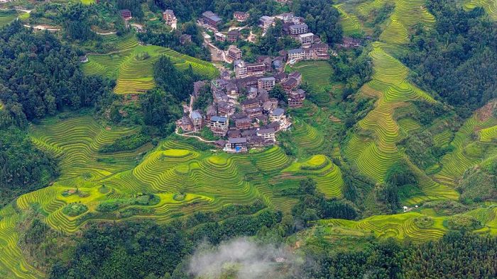 这片梯田始建于元朝,是大自然与人力共同造就的奇迹——大自然劈出山峦,先辈们在山上开垦梯田,经岁月流转与代代耕耘,成为傲立天地间的奇景。春灌时,梯田波光粼粼如碎镜;秋收时,金黄稻浪翻滚似绸缎,站在高处俯瞰,壮阔美景尽收眼底。