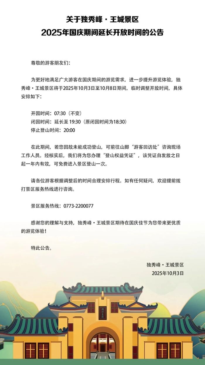 10月3日上午,桂林象山景区发布了《国庆中秋黄金周游览提示公告》,建议游客提前做好计划、错峰入园游览,同时注意景区出入口安排及开放时间。傍晚独秀峰·王城景区发布了《关于独秀峰·王城景区2025年国庆期间延长开放时间的公告》,10月3日-8日闭园时间延长至19点半。具体内容如下: