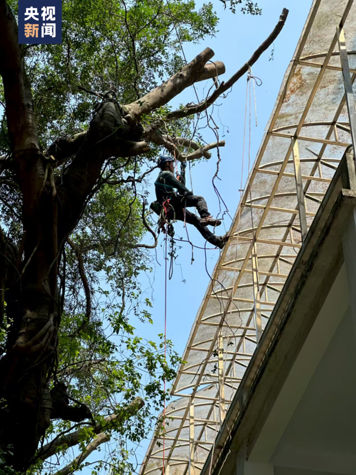 但常年生活在榕树之下,遮天蔽日,导致周边房屋潮湿发霉。这时,就需要攀树师上树修剪。