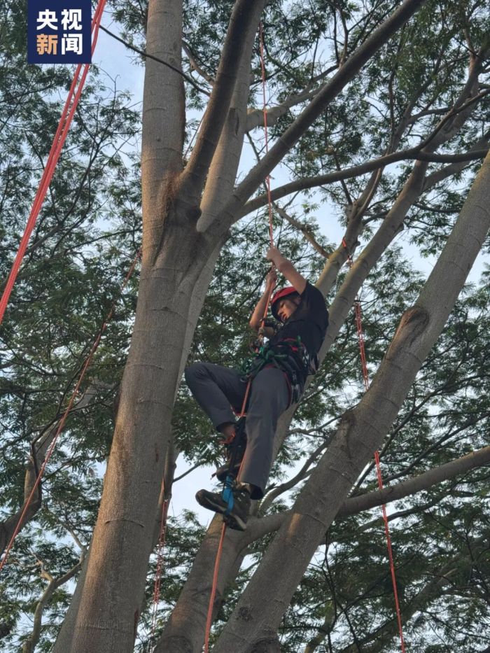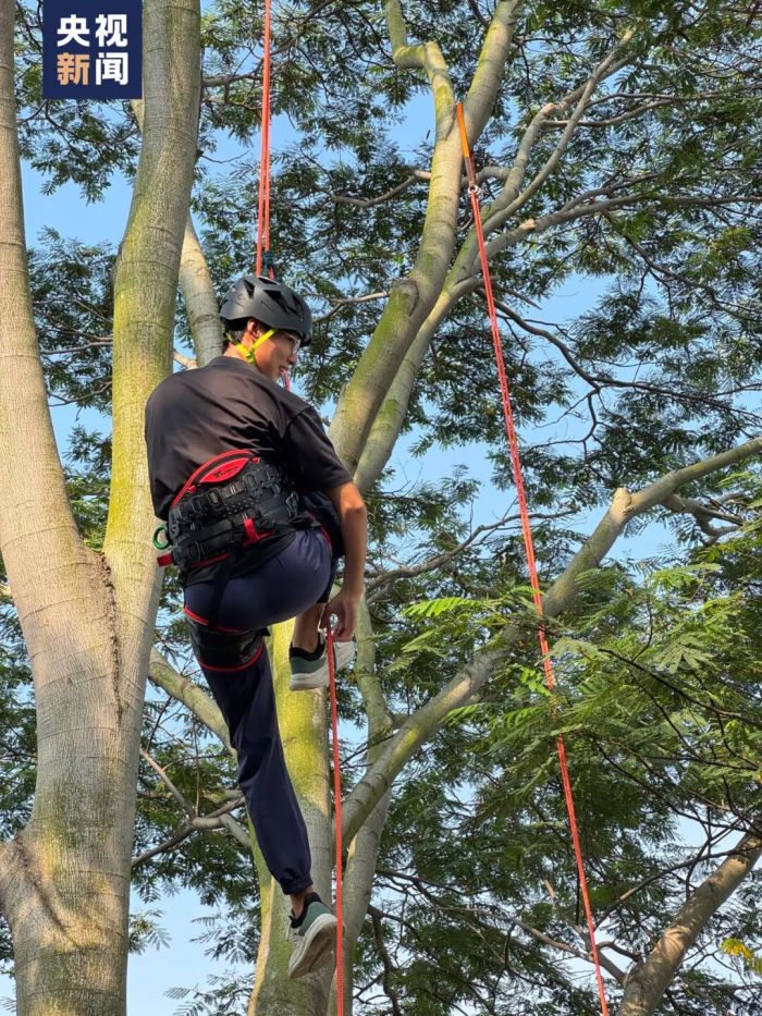 郑达雄介绍:“攀树师不仅要熟练使用各类攀树装备与器械,还需了解树木养护、病虫害防治等树木学知识。同时,良好的运动能力和体力也是重要的职业素质。”