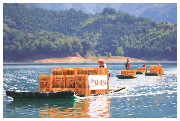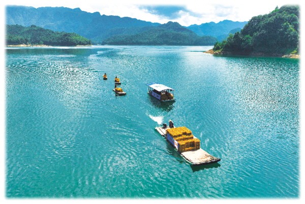 10月8日,寒露时节,在永福县堡里镇茶料村,青山环抱的板峡水库湖面上,几张载着罗汉果的竹筏正缓缓前行。