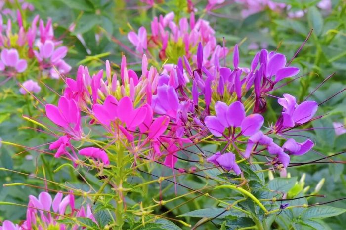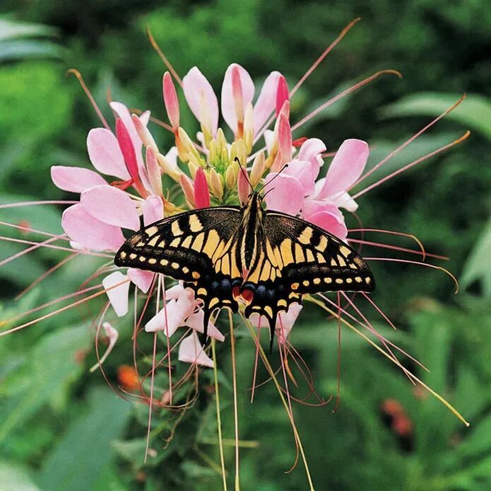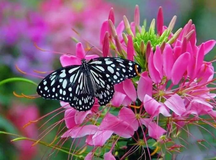 风一吹,千万朵花便摇曳着,像振翅的彩蝶,连空气里都飘着浪漫的气息。仔细看,你会发现,无数漂亮的真蝴蝶在醉蝶花丛中飞舞沉醉。