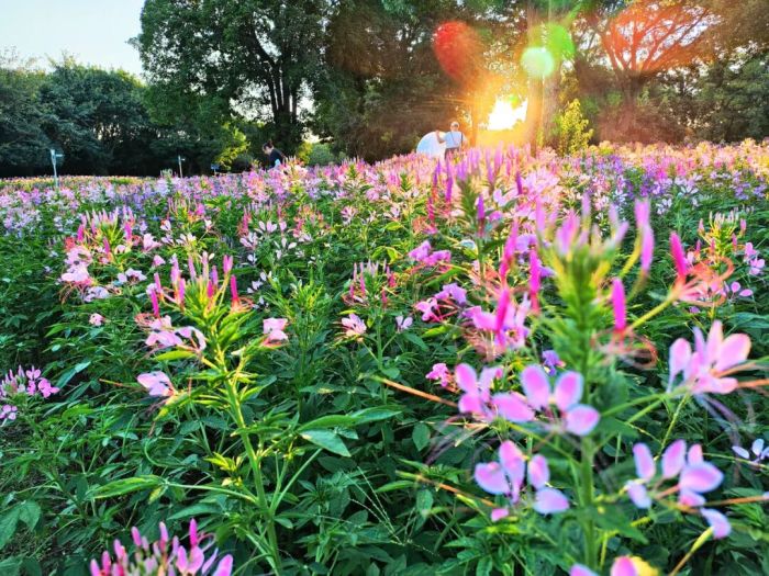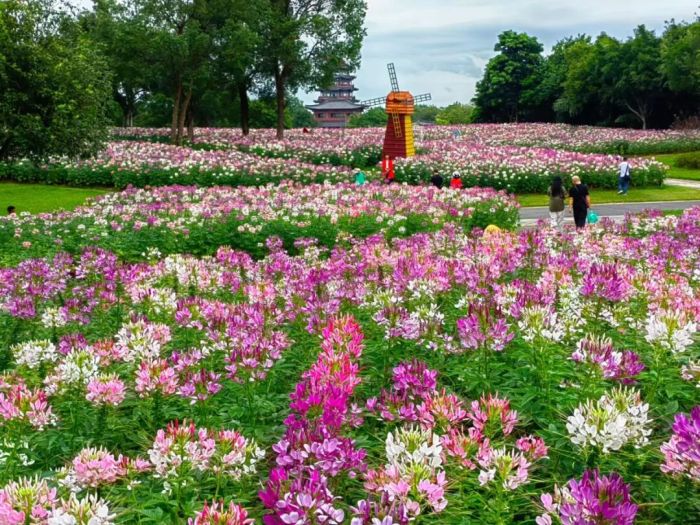 走在花间小径上,两侧醉蝶花伸手可及。细长的花茎托着层层花瓣,风过时花瓣轻轻颤动,仿佛下一秒就会有蝴蝶从花穗里飞出来,随手一拍就是能当壁纸的画面。