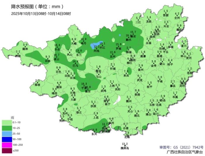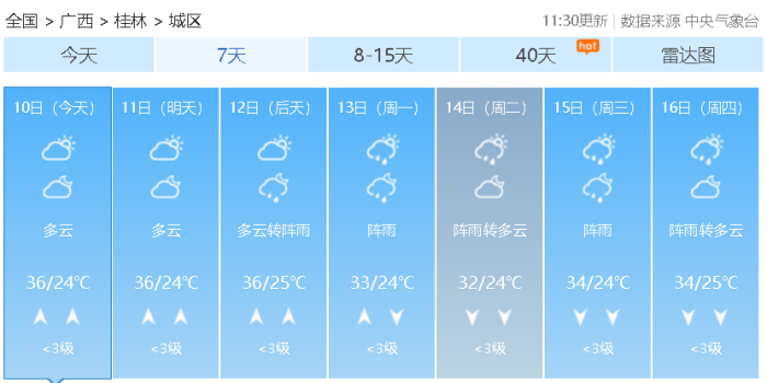 今天下午,桂林市气象局对新一周的天气走势预测正式出炉:未来一周(10 月10-17 日),桂林继续以多云天气为主,局部有短时阵雨或雷雨,与常年同期相比,气温偏高,雨量偏少。