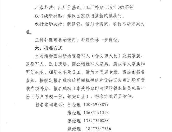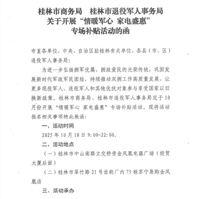 为进一步弘扬拥军优属、拥政爱民的光荣传统,巩固发展新时代军政军民团结,持续推动双拥工作高质量发展,让更多现役军人、退役军人和其他优抚对象参与享受国家以旧换新政策,桂林市商务局、桂林市退役军人事务局定于10月份开展“情暖军心 家电盛惠”专场补贴活动。