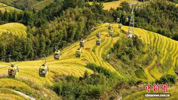在广西桂林市龙胜各族自治县龙脊镇大寨村,游客乘坐索道观光游览梯田。(无人机照片)潘志祥 摄