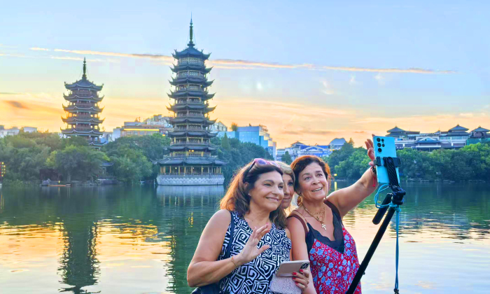 图为三名来自瑞典的游客打卡桂林两江四湖“日月双塔”