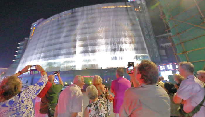 图为一队德国游客在桂林观看“上海大世界基尼斯纪录”人造瀑布表演。