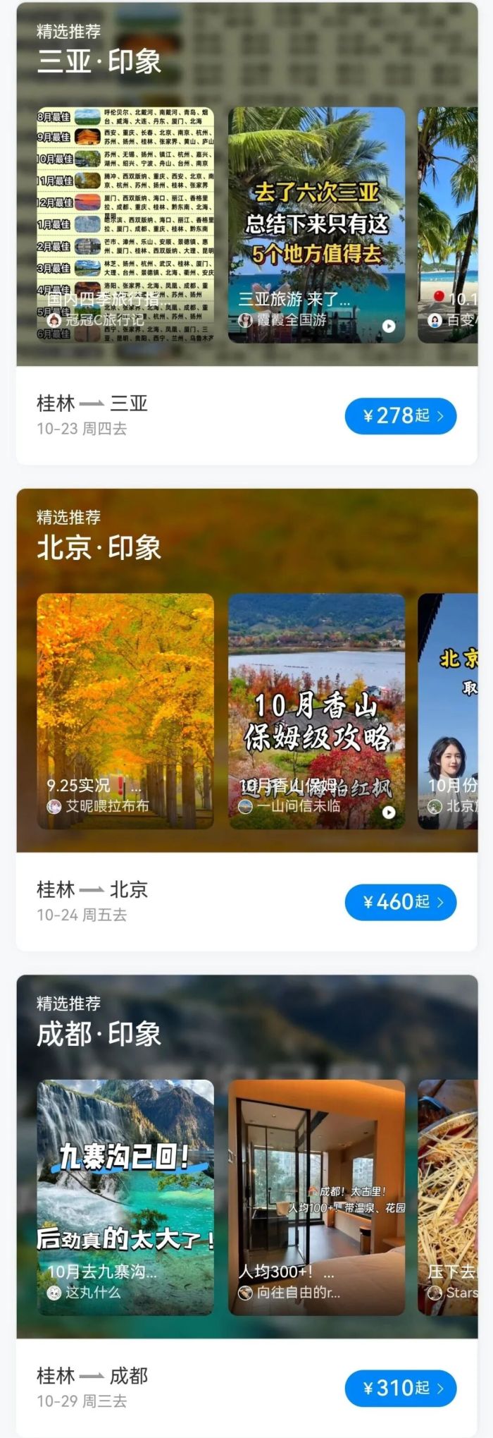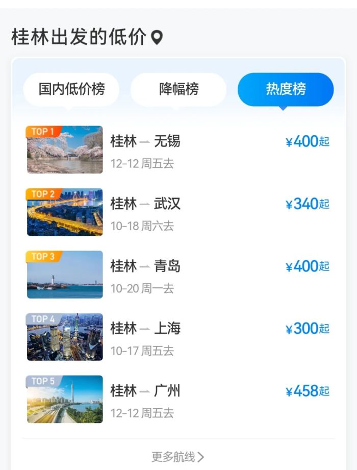飞往三亚、成都等热门城市的机票也都是两三百元