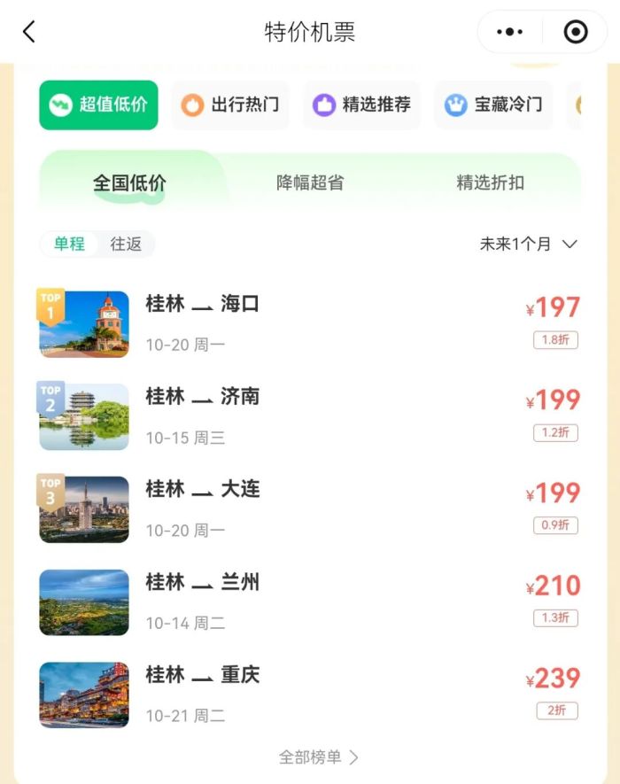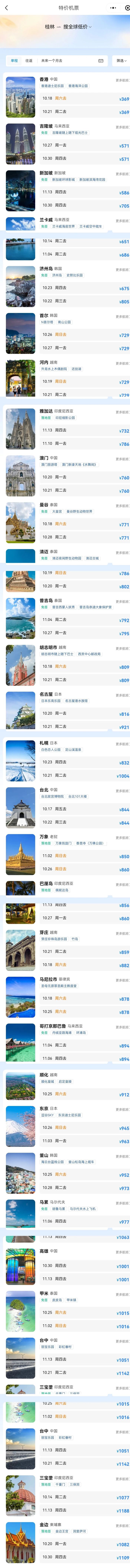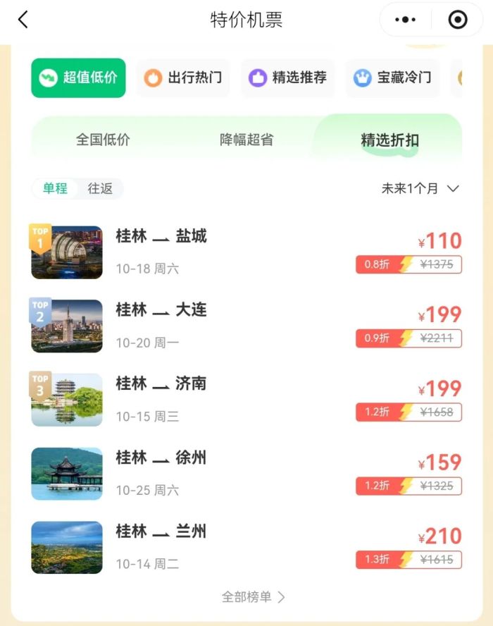 10月18日,桂林飞盐城的机票更是打到“骨折”仅0.8折,只要110元