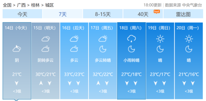 从中国天气网推出的大城市降温日历来看,10月19日前后,距离桂林不远的长沙,最高气温或降至16℃左右。桂林作为广西“北大门”,也会率先领教到这股强冷空气的“威力”。截至发稿时,广西、桂林的气象部门尚未对这股冷空气所造成的影响发布具体预测数据。小编将持续关注,一有消息及时发布。