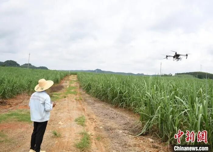 广西甘蔗种植户使用无人机作业。林浩 摄