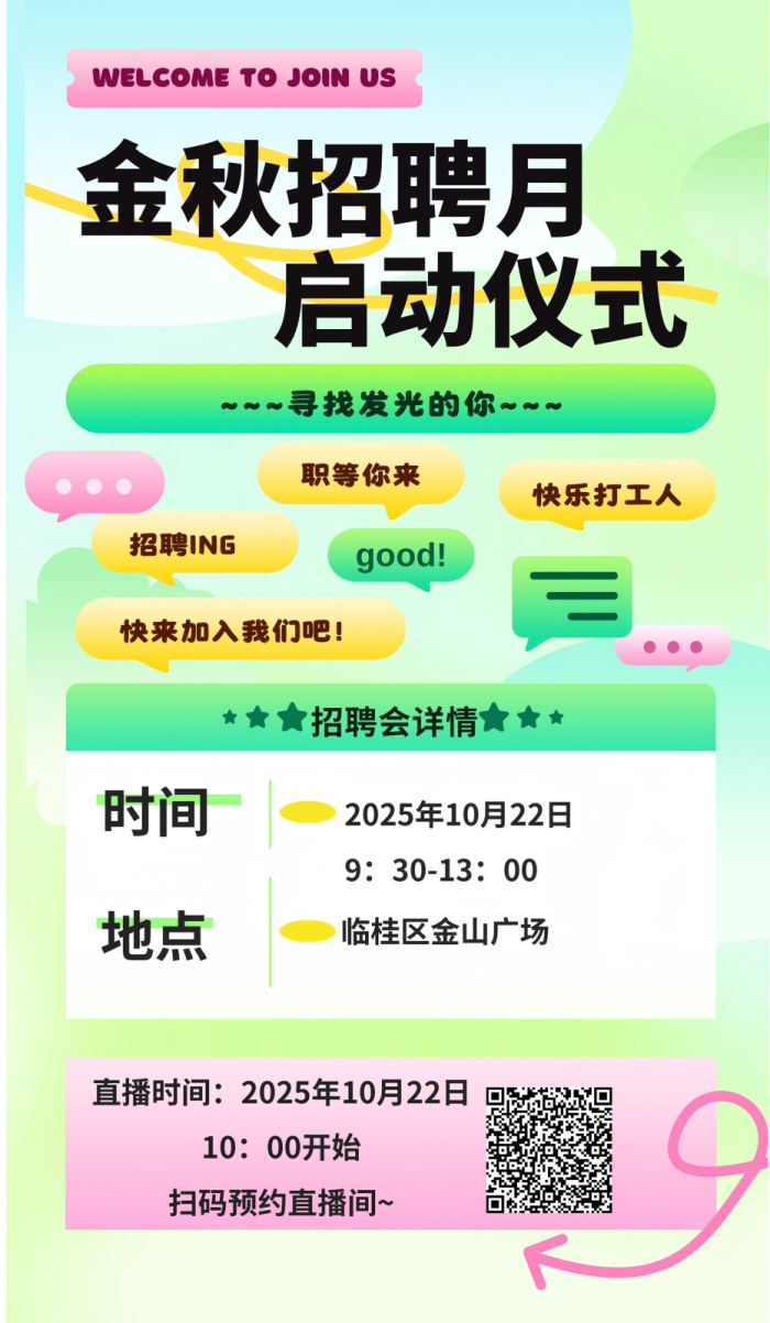 为全面贯彻党中央、国务院决策部署,推进实施就业优先战略,优化人力资源配置,加强市场供需对接,推动实现高质量充分就业,根据《人力资源社会保障部关于开展 2025年全国公共就业服务专项活动的通知》要求,我市拟于2025年10月22日在桂林市临桂区举办“2025年桂林市金秋招聘月活动启动仪式暨临桂区重点企业专场招聘会”