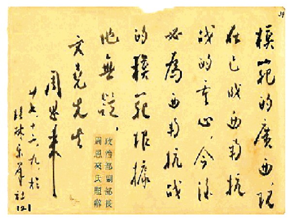 “模范的广西,现在已成西南抗战的重心,今后必为西南抗战的模范根据地无疑。文尧先生,周恩来。”周恩来到桂林曾下榻于乐群社。以上是他的题字。不仅是对广西的勉励,也永远地将乐群社与中国的抗战事业紧密相连。