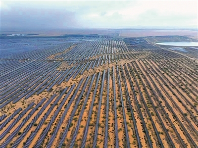 “十四五”时期,我国建成全球规模最大的碳排放权交易市场并稳定运行,覆盖全国60%以上的碳排放量,绿色发展的内生动力和创新活力明显提升。图为在内蒙古境内的库布其沙漠里,一块块蓝色光伏板将沙海变成绿能涌动的“蓝海”。