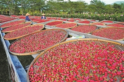 “十四五”期间,我国城镇新增就业累计达到5921万人,超额完成5500万人的目标任务。图为三亚市吉阳区博后村海南玫瑰谷产业园区的产业工人在晾晒玫瑰花。
