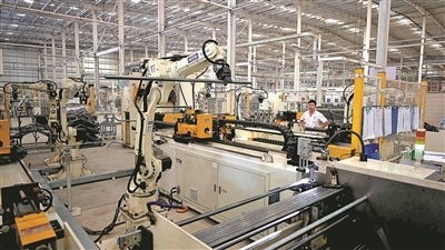 2024年我国全部工业增加值完成40.5万亿元,制造业总体规模连续15年保持全球第一,工业和信息化领域对经济增长的贡献超四成,有效发挥“稳定器”“压舱石”作用。图为在广西绿源电动车有限公司,机器臂在智能化生产线上作业。覃庆和 摄