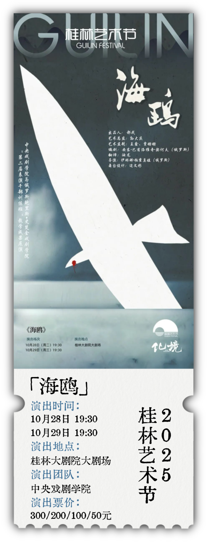 这一次,这只象征艺术理想与人性挣扎的“海鸥”,经中戏与俄罗斯导演的联合诠释,带着全新的舞台呈现与情感表达,“飞”入桂林大剧院的舞台,与观众在山水环抱中相遇。