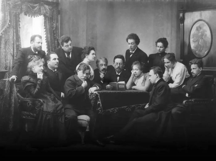 ▲契诃夫在莫斯科艺术剧院与斯坦尼斯拉夫斯基、涅米罗维奇-丹钦科等阅读《海鸥》剧本