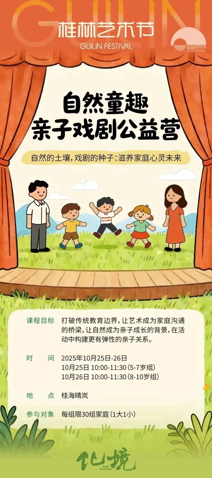 亲子戏剧公益营是桂林艺术节戏剧教育板块的重点项目。本次公益营旨在打破传统教育边界,让艺术成为家庭沟通的桥梁,让自然成为亲子成长的背景。本项目以戏剧为媒介,为亲子家庭打造一个共同学习、共同成长的创意平台。通过两天的沉浸式体验,家长与孩子将在表演、协作与想象中,重新发现教育的温度与广度,构建更有弹性的亲子关系。