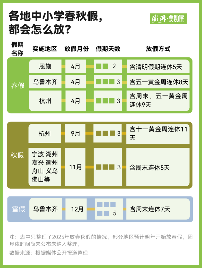 到了2025年,更多地方开始落实中小学生“春秋假”,其模式基本是与清明、五一、国庆等小长假连休。值得一提的是,乌鲁木齐市还在今年将12月 1日至12月5日定为“雪假”,并为中小学生提供免费滑雪的机会。