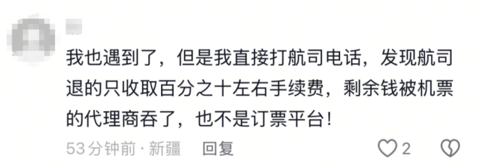 也有网友分享自己的经历称,退票手续费不全是由航空公司收取的,而是大部分由机票代理商收取。