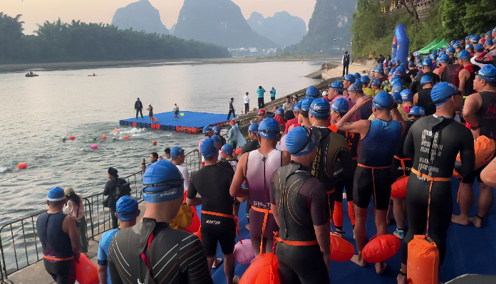 2025阳朔铁人三项赛第二个比赛日鸣笛开赛,中外选手破浪漓江 解锁世界级赛道