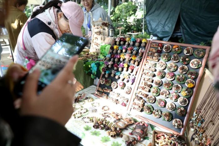 本届桂林艺术节城市艺术板块负责人、中央戏剧学院导演系薛晓涵在接受采访时说,自2023年起,城市艺术板块便成为桂林艺术节的重要组成部分。每一届都会结合不同场地与元素进行创新策划。今年的山水市集在商家筛选上更是别具匠心——50个摊位中,45个为常规摊位,5个为特殊主题摊位,其中手工文创类摊位达37家,摊主多为手工艺人,有桂林本土的,也有广西其他城市的。他们将广西元素、桂林元素融入作品中,用一件件作品讲述桂林故事,推动地域文化的传承与创新。