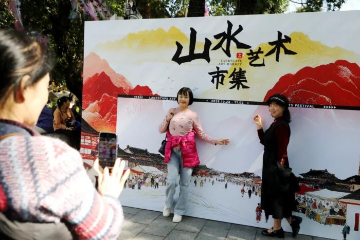作为本届山水市集的一大亮点,“山水、城市、戏剧”的深度融合,让艺术气息渗透到每一个角落。古南门的古建筑与两江四湖的碧水青山相映成趣,成为天然的“戏剧舞台”;市集的布景中,随处可见印着经典戏剧台词的画布、展板,为市集增添了文艺氛围。