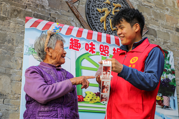 2025年10月27日,广西桂林市灵川县定江镇莲花村,志愿者帮老人和孩子们拍摄搞怪照片。阳海翔 摄