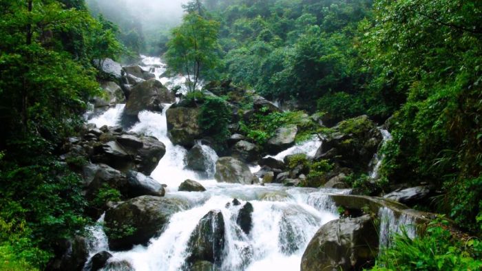 山涧深处的仙女沟瀑布,重峦叠嶂间水流层层叠叠,翠竹密布环绕,水质清澈见底,宛若仙境。