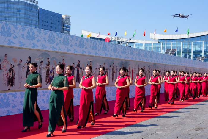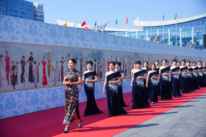 从下午2点开始,氛围感直接拉满!东方旗袍全体会员、嘉宾们身着苏绣、织金等各式雅致旗袍陆续踏上红毯,折扇、披肩等细节巧思满满,每一步都走出东方女性的温婉与自信,现场快门声此起彼伏。她们作为旗袍文化的传承者,承载东方文化精髓,融合传统诗意与现代审美。