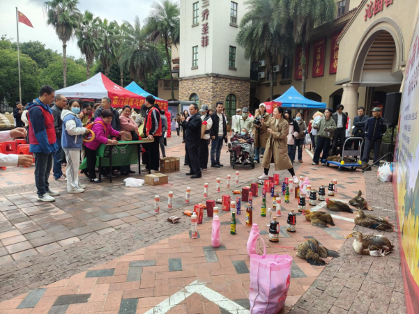 文艺演出结束后,紧接着登场的是热闹的游园活动。现场设置了套圈,居民们踊跃参与,瞄准心仪礼品投掷圆环欢呼声此起彼伏。活动礼品丰富实用,既有鸡、鸭等鲜活家禽,也有洗衣液、纸巾等日常用品,还有各类零食满足味蕾。