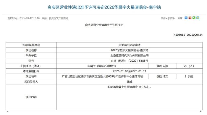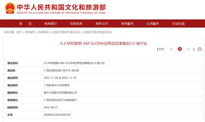 邓紫棋《I AM GLORIA》世界巡回演唱会2.0—南宁站在广西体育中心主体育场举行,批复的演出时间为2025年11月28日至30日。