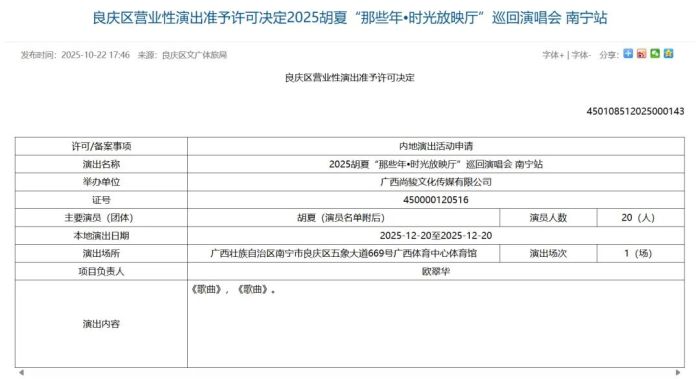 2025胡夏“那些年•时光放映厅”巡回演唱会 南宁站在广西体育中心体育馆举行,时间为2025年12月20日。