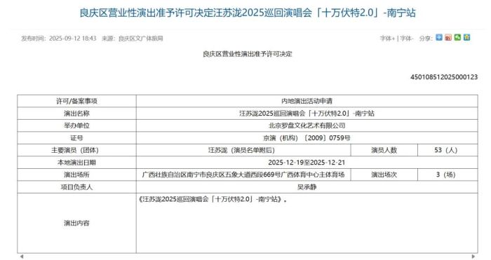 汪苏泷2025巡回演唱会「十万伏特2.0」-南宁站在广西体育中心主体育场举行,演出时间为2025年12月19日至21日。