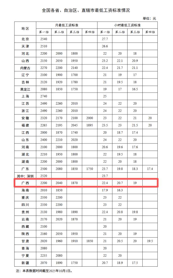 目前,还有其他省份的调整方案待正式执行。江西省人社厅发布征求意见稿,拟将一类区域最低工资标准由2000元调整到2240元,二类区域由1870元调整到2090元,三类区域由1740元调整到1950元,计划从2025年12月1日起执行。西藏自治区人民政府办公厅转发意见,将月最低工资标准由2100元调整为2360元,非全日制用工小时最低工资标准由20元调整为23元,调整后的标准从2025年11月1日起执行。