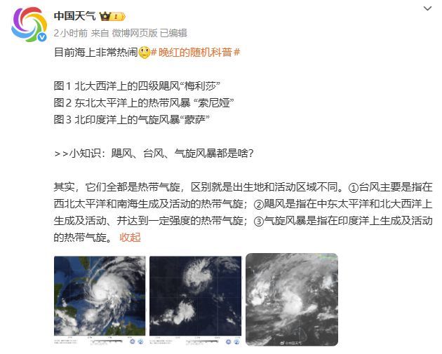 目前海上非常热闹,北大西洋上的四级飓风“梅利莎”、东北太平洋上的热带风暴 “索尼娅”、以及北印度洋上的气旋风暴“蒙萨”在海上共舞。